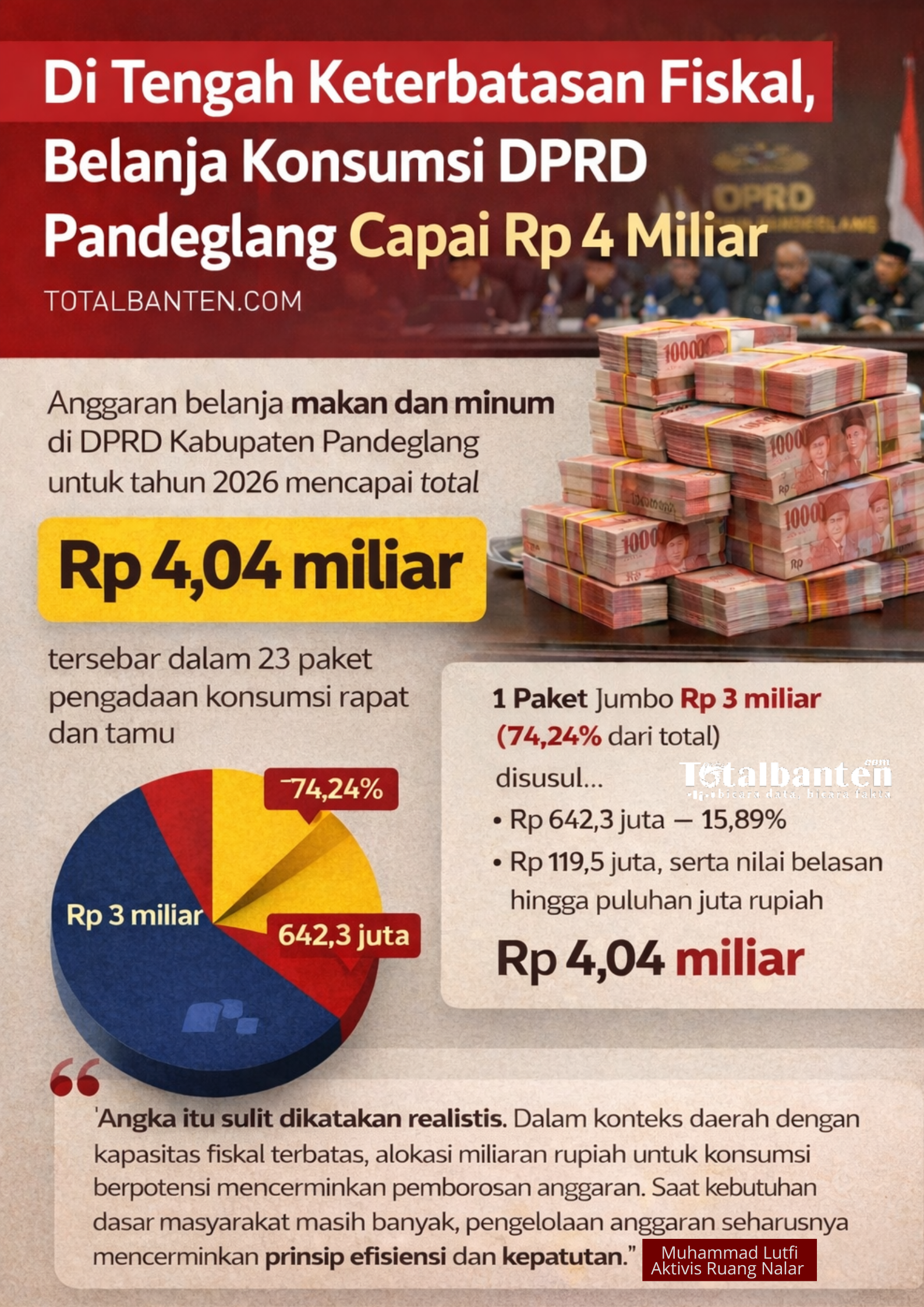 “Angka itu sulit dikatakan realistis. Dalam konteks daerah dengan kapasitas fiskal terbatas, alokasi miliaran rupiah untuk konsumsi berpotensi mencerminkan pemborosan anggaran,” kata Lutfi kepada wartawan, Senin (23/2/2026).